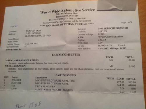 The wheels are 18 inches and look great (Boxster S's have 18 inch tires). I've invested $1600.00 in brand new Michelin Pilot Sport Tires and they only have 10,000 miles on them. I also do all my oil/fluid changes at World Wide Auto.