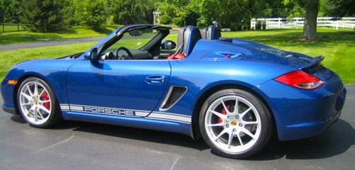 A showroom condition,very low mileage 2011 Porsche Boxster Spyder in rare Aqua Blue Metallic with black leather interior. Current mileage is 4300. Car has been driven only in fair weather and kept in a temperature controlled garage year round. All scheduled maintenance performed by dealer. Features: Sports bucket seats, Bluetooth, Radio with CD player. No air conditioning (saves weight). California Car Cover included.