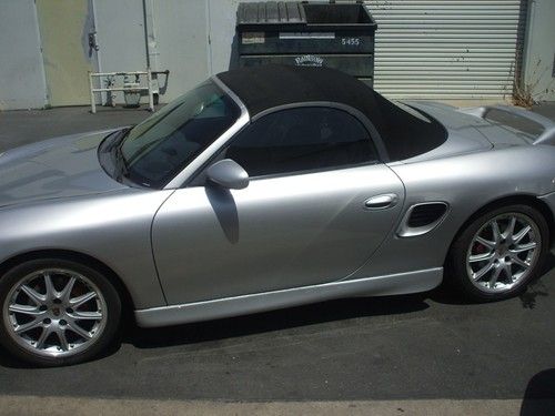 Porsche Boxster 2001 used car in very nice condition has rear spoiler,side skirt rockers,gps,cd player am/fm pioneer unit with ipod adapter,carbon look vinyl throughout, 4 spoke steering wheel, air conditioning, cruise control, air bags, motor was replaced at 149,000 miles, 5 speed transmission, silver exterior, black interior, dual mirrors, 10 spoke factory alloys,convertible top in good condition, runs good, clean title