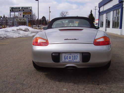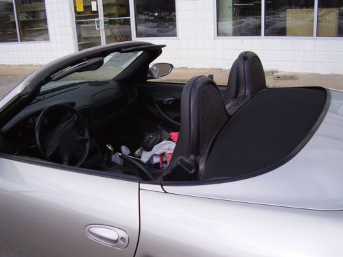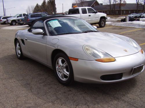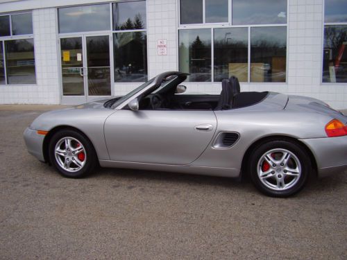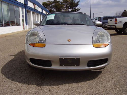 BUY WITH CONFIDENCE "NO RESERVE" ABSOLUTE AUCTION. 2000 PORSCH BOXTER WITH 9000 ORIGINAL MILES PER YEAR BY 2 OWNERS. (149000). ALWAYS A FLORIDA CAR. PAINT, TOP WHEELS, TIRES ALL IN EXCELLANT CONDITION. NO DENTS, SOME ROAD RASH CHIPS THAT HAVE BEEN PAINT CHIPPED ON FRONT BUMPER AND HOOD. LOOKS GREAT. INTERIOR IS IN EXCELLANT SHAPE. NEVER BEEN DYED OR FIXED AND THERE IS VERY LITTLE WEAR ON THE DRIVER BOLSTER SEAT. POWER TOP WORKS PERFECT AND IS IN EXCELLANT SHAPE. TIRES HAVE 70% TREAD LEFT. NO REAR END , BEARING OR TRANSMISSION NOISE OR ISSUES. ENGINE IS STRONG ,RUNS AND PERFORMES LIKE NEW WITH NO OIL LEAKS OR BLOW BY. BID WITH CONFIDENCE, YOU WILL NOT BE DISSAPPOINTED. FOR SALE LOCALLY AND SELLER MAY END AUCTION AT ANY TIME.LOCATED IN LOWER MICHIGAN