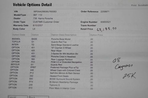 I am the second non-smoking owner of this rare Cayman. I purchased it in Jan of 2011 w/25K miles & I have put 16,000 miles on it since. The options on this car were expensive and most are not equipped this well.
