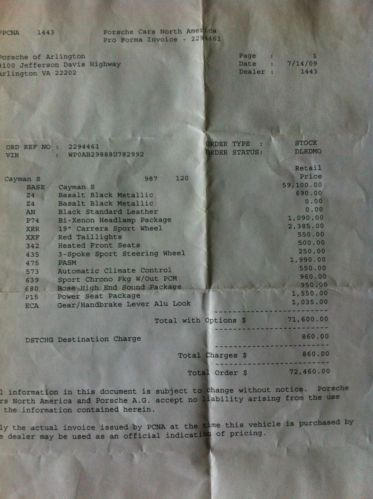 The sticker price when originally purchased was $72,460. In addition to the added factory options please take note of the aftermarket upgrades also included in this Porsche Cayman S, totaling a minimum of $15,000 in upgrades: Borla Cat-Back Exhaust System Electric Yellow Powder Coated Brake Pads Matching Electric Yellow Powder Coated Billet License Plate Frame w/ Porsche Emblem Bolts Sarona Body Kit LED Lights Installed in Grill Purple LED interior lighting (switchable on/off button) Vehicle Entertainment System: Pioneer Head Unit with Ipod Connectivity 7 Inch Touchscreen Phone Integration/ DVD/ Navigation System Memory Card Supported: SD Card Two (2) 6’ JL Audio Subwoofers 900W/5 Channel JL Audio Amp Focal Speakers Full Cinematic HD Surround Mode Vertini Riviera-S Black Machining Face Wheels with 2 inch lip and Black Porsche Center Caps R Inspired Cayman S Stripe Decals A Stunning, Classy, and Sporty Porsche Cayman S!! A Porsche enthusiast's ultimate car! Low mileage ? Fully Loaded ? Excellent condition ? Clean History ? Professional aftermarket upgrades ? Tons of Car at a Fantastic Price ? If you have any questions about the car please contact me! Good Luck! |