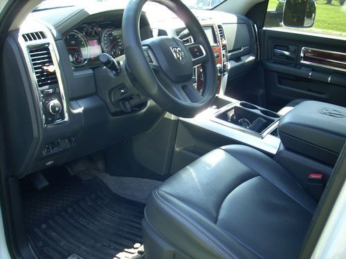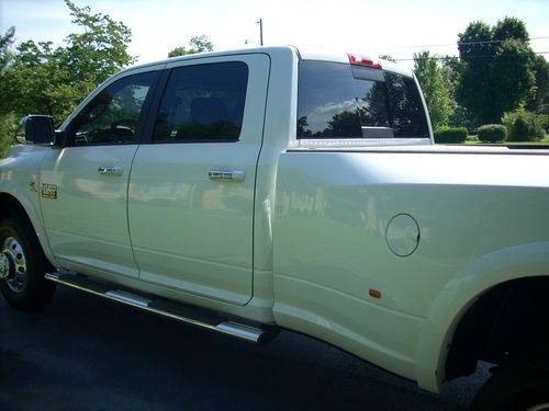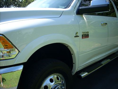FOR SALE IS A NICE 1 OWNER RAM 3500 LARAMIE 4X4 CREW CAB THAT I BOUGHT BRAND NEW IN OCT 2011. TRUCK HAS THE 800FT LBS OF TORQUE ENGINE, AUTO, ENGINE BRAKE, NAVIGATION, LEATHER, HEATED SEATS, AC SEATS, REAR BACK UP CAMERA. TRUCK IS WHITE AND DARK GRAY INSIDE. IT HAS THE FACTORY RHINO LINED BED AND FACTORY B+W FLIP OVER HITCH. IT ALSO HAS THE ORIGINAL GENERAL TIRES FROM BRAND NEW STILL ON IT, WHICH THEY HAVE 25,500 MILES ON THEM. FRONT TIRES STILL HAVE ALOT OF TREAD LEFT ON THEM. TRUCK HAS BEEN ONLY DRIVEN BY ME, FOR MY BUSINESS. I HAVE NEVER WRECKED THIS TRUCK OR ANY ISSUES- IT HAS BEEN THE BEST TRUCK I HAVE EVER OWNED- JUST TOO BIG FOR ME RIGHT NOW. I'M GOING TO A 3/4 TON. TRUCK DOES HAVE A LEIN ON IT THRU CHASE. I AM DRIVING IT EVERYDAY SO MILES WILL CHANGE. ANY QUESTIONS CALL ME AT 270-556-2641 . I WILL AUCTION IT AS A BUY IT NOW PRICE OR BEST OFFER. THANK YOU