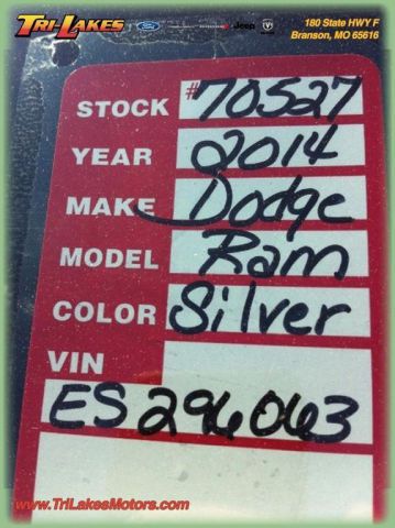 Contact us about this beautiful vehicle. We would love to give you a quote on this vehicle including the specialized incentives you may be eligible for. This 2014 Ram 1500 Express will make you a very happy camper, We also will throw in your first oil change for free and we have NO DOC fees. Find this beauty at Tri-Lakes Motors in Branson. Just a short drive from Springfield and Harrison. Our definition of short is around 30 mins. No FEES and a downright great place to do your business. WE will earn your business. Give us a call and we will do a one of a kind walk around on this vehicle. You can watch this video from the comfort of your home or the convenience of your phone. Call Cory 888-839-7165 with any questions and to make sure this vehicle or the terms are still AVAILABLE. Tri-Lakes is a Franchise dealer for Ford, Chrysler, Dodge, Jeep, and Ram. This means we try to make sure our pre-owned vehicles in turn are in like new car shape and quality. Offer is not valid with any other offer. We take trade-ins and can finance almost anyone through our 14 lenders.