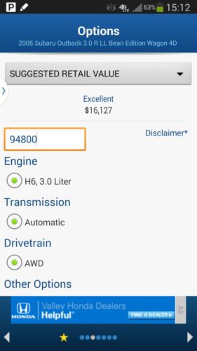 Exotic Auto Brokers offers for sale 2005 Subaru Outback Wagon LL Bean Edition Clean title 94,800 original miles 3.0 Liter, six-cylinder 250 hp engine five-speed SportShift automatic transmission ABS Air Conditioning Power windows Power door locks Cruise control Power steering Tilt wheel AM/FM/6-CD player with steering wheel controls Dual air bags Side air bags Dual power/heated seats Two-tone leather seats Dual moon roofs Roof rack Alloy wheels Like new set of Pirelli P6 Allroad tires Two set of keys & Owner's manual -------------------------------- The Subaru runs and drives very good! --------------------------------------------------------------------- If you want to have the vehicle inspected by your own mechanic / service facility, please schedule it before the sale ends! ------------------------------------------------------ The vehicle is sold as-is. No warranties expressed or implied. There in NO RETURN policy. ------------------------------------------------------ Do you have questions about this vehicle? Call Marius @ 480-381-1945 ------------------------------------------------------