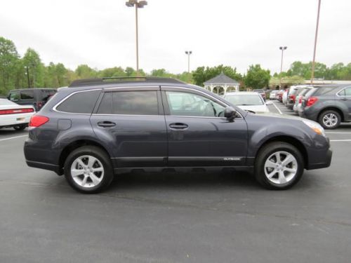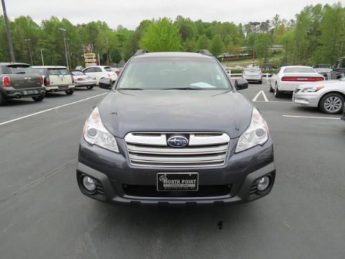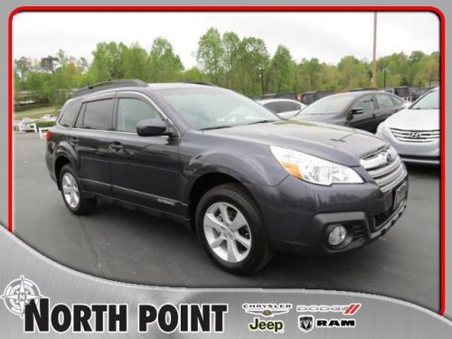This graphite gray metallic 2013 Subaru Outback 2.5i Premium offers the ample space of a larger crossover in the well-envisioned package of a wagon! A renowned, horizontally-opposed Boxer engine allows optimal balance and a smooth ride, while also increasing practicality, thanks to its AWD component, enabling ease in navigating the elements! This Outback averages impressive gas mileages of 24/30 MPG and also earned praise from the IIHS in crash testing, receiving good in frontal-offset, side and roof strength categories! Standard conveniences on this upscale 2013 Subaru Outback 2.5i Premium include paddle shifters, full power accessories, A/C, cruise control, speed-sensing steering, 6-speaker AM/FM/CD/USB interface/MP3 connectivity, auto-dimming rear view mirror, tilt/telescoping leather-wrapped steering wheel with mounted audio controls, heated front seats (8-way power driver seat with lumbar support), premium black cloth upholstery, automatic headlights, roof luggage racks, spoiler, 17 inch alloy wheels, daytime running lights and fog lights! With rear seats folded, cargo capacity is plentiful and caps out at 71.3 cubic feet, which competes with larger crossover SUV stats! With less than 2,500 miles, this vehicle is still covered under manufacturer warranty and has a clean, one owner Carfax history! Call North Point Chrysler Dodge Jeep Ram, located in Winston Salem, NC, to schedule a test drive today! You have made the right Choice by Contacting North Point Chrysler Jeep, Here's why? - Winston Salem's only Five Star Chrysler-Jeep Dealership - #1 Chrysler-Jeep Dealer in NC/SC -Top 50 Chrysler Volume Dealers in the U.S.A. - Nearly 400 vehicles in stock. "Stop Shopping and start driving"