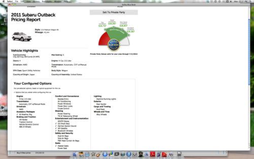 2011 Subaru Outback 2.5i Premium - Very Clean, Excellent Condition - Exterior Color: Steel Silver Metallic Interior Color: Black Mileage: 45,344 VIN: 4S4BRBFC2B3377177 All Wheel Drive; 22 CITY MPG; 29 HWY MPG 45,000 Mile Service completed on 6/12/14; New Rear Brakes 4/2014 Clean Vehicle History Report - can email details. See screenshot in photos. Still under 60,000/5 year drive train warranty and rust warranty. We purchased the Maintenance service package from the Subaru dealership when we bought the car - this package covered all maintenance through 45,000 miles. This vehicle has been very well maintained!!!