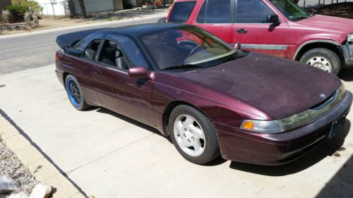 1992 subaru svx sat in the az sun for about 5 years then i picked it up. runs great but leaks oil from sitting so long. will have two dounuts to throw on rear as tires on back wheels are shot. but have all four wheels and caps fuel tank needs to be cleaned out with new pump. needs tranny has reverse, second and third gear no o/d so not fast enough to drive home. paint faded but straight body and everythings there no radio someone pulled it out but i still have it.aslo interior is typical az sun damage.