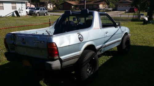 This is a custom Subaru Brat. I bought two of them when I was in Alaska and was able to make one good one out of the parts from the other. I get a lot of cool stories and thumbs up everywhere I go with it. This has been my daily driver for the past 6 years. I have done all the mods myself. The only things that have ever gone bad for me were the starter and alternator. I have put new wheel bearings and seals, axle shafts, and larger radiator for the larger engine. It has a fuel injected 2.2 out of a 1995 wagon with 170hp. The stock engine only had half of that. The engine had 80,000 on it when I removed it from the wagon. I have since put about 3000 miles/year. I work only 6 miles from home and ride my motorcycle often. It has 6 lug hubs with new Chevy 6 lug wheels and tires. I put a 5 speed out of a 1989 wagon in it. The Brat never came with a 5 speed. This transmission is a 4x4. The original 4 speed comes with the truck as well. The 4 speed has 2hi, 4hi and 4low the 5 speed has just 2hi and 2low. The linkage in the 5 speed is getting loose and will need some attention soon but still works fine. It comes with 3 sets of wheels and tires. One set of U255's with Strata 255/35ZR20 tires 75% tread left, the second set is Good year Wranglers P235/75R15 on new black rims with 90% tread left and the third set were studded tires I used in Alaska. I removed the studs and the tires are almost bald now but the wheels are good.