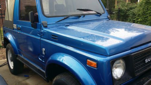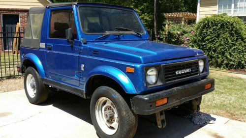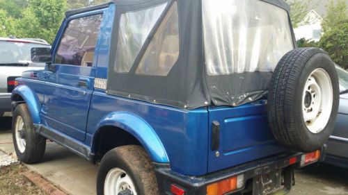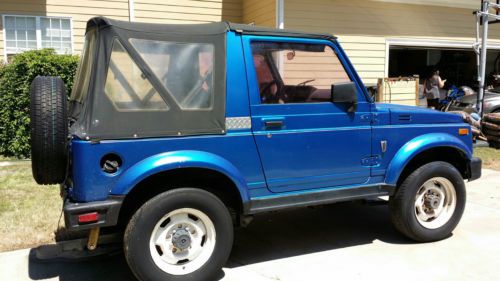 YOU ARE LOOKING AT A RARE FIND. THIS CLASSIC 1991 SUZUKI SAMUARI IS A 5 SPEED . I BOUGHT THIS BRAND NEW IN 1991 AND HAVE KEPT IT IN GREAT SHAPE. I HAD IT REPAINTED FROM THE ORIGINAL WHITE TO A BLUE. I HAD THE SEATS REDONE. ADDED A 2 INCH LIFT KIT NEW EXHAUST NEW SHOCKS . JUST HAD FULL TUNE UP INCLUDING PLUGS CAP ROTOR NEW BATTERY RADIATOR FLUSH , OIL CHANGE, DIFFERENTIAL OIL CHANGE . JEEP NEEDS NOTHING MECHANICALLY DONE. IT DOES NEED NEW TIRES BUT I AM INCLUDING A BRAND NEW SET OF AMERICAN RACING WHEELS WITH THE JEEP . I WAS GOING TO PUT 31 INCH TIRES ON IT THATS WHY I LIFTED IT AND WAS GOING TO GIVE IT TO MY DAUGHTER SINCE SHE WAS LITTLE . SHE IS GROWN NOW AND DOES NOT WANT THE JEEP SO I DECIDED TO SELL IT. THERE IS NOTHING MECHANICALLY WRONG AT ALL AS IT ONLY HAS 51000 MILES ON IT. THE GAS GAUGE STOPPED WORKING ABOUT 3 YEARS AGO SO I JUST FILL IT UP AND DRIVE 300 MILES BEFORE BUYING GAS AGAIN. IT MIGHT BE A FUSE. IF YOU HAVE ANY QUESTIONS PLEASE FEEL FREE TO CALL 770-883-4824. I LIVE 10 MINUTES FROM THE ATLANTA AIRPORT SO FLY IN AND DRIVE IT BACK. WE CAN HELP ARRANGE FOR SHIPPING TOO FROM ZIP CODE 30290 . THIS IS A RARE FIND AND A GREAT JEEP TO FINISH THE CUSTOMIZING WITH THE WHEELS. IF YOU WANT A GREAT RUNNING CLASSIC WITH LOW MILES THIS IS IT