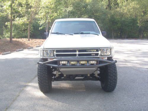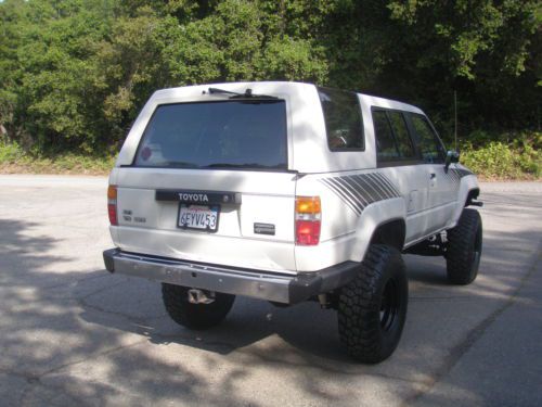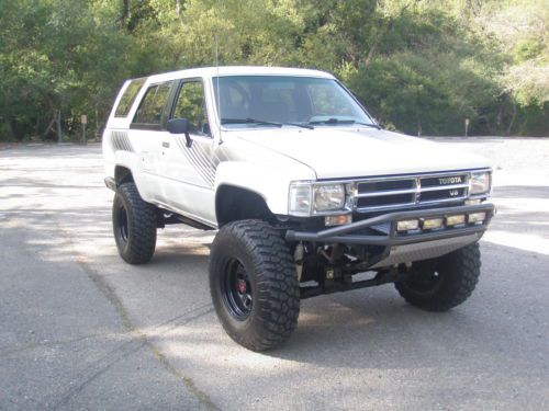 Selling this well kept, 1988 Toyota 4Runner, SR5, V6, 4WD. It is finished in white on gray. It runs great and was previously owned by a mechanic who performed a top-end rebuild. Timing belt, water pump, hoses, belts and head gaskets were changed at 200,000. It currently has 219,507 on the odometer now. If you have been looking for a well kept, first generation 4Runner then, this one is for you. It just looks GREAT. The interior is nice. The white paint still shines nice with some small blemishes and bruises(see photos and video). You can get in this car and drive wherever you want. The A/C blows cold, the heater blows hot. The stereo will rock your world. It has a ProComp lift. It rides on BFG tires with great deep tread. You do not need to do anything other than enjoy the ride. I bought this for my 16 year old son. After hearing a bunch of noise from his mother about no airbags and anti-lock brakes, I decided to silence the 'old bag" and sell it. It also has an alarm that is hooked up to the horn to give it a loud blast. Check out the wood Grant steering wheel. The 4Runner will need an oil pressure switch so the gauge in the dash will register again. Other than that, everything works, from the power rear window to the deck lamp. Nothing more I can say except that I will be sad to see it go.