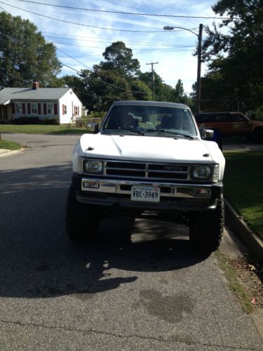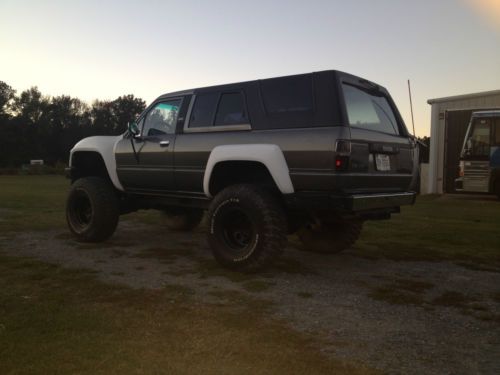 1989 Toyota 4Runner/Prerunnerlifted 5speed shifts great new clutch, 35in bfg mud terrain km2 they do not rub at all full tread nice rims , aftermarket prerunner body kit that still needs paint, rebuilt engine with 7thousand miles, aftermarket head and pro cam cold air intake engine looks very good and clean, runs great, new inspection , aftermarket gauges,new spekers , comes with cobra cb, truck is wired for subs ,back window is electric and goes up and down ,heat works great , ac does work just needs a charge,i have some of the paper work of the things that have been done,i will be putting up pics of engine and interior by friday .over all is a great truck , happy biding !
