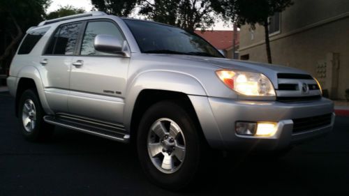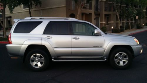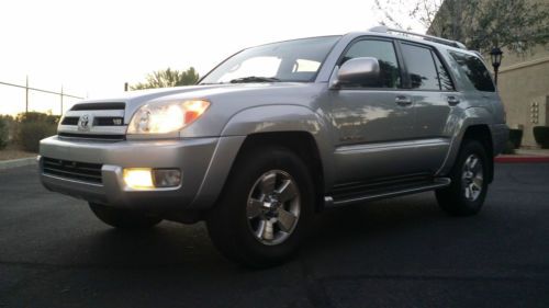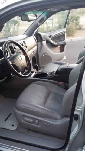 Up for sale is a 2 owner Limited 4Runner that spent all of its life in Arizona. This is the Top of the Line, LOADED Toyota 4 Runner. Torsen Differential with locking option (4x4), XREAS Suspension, DAC Control, leather interior, all power, Sunroof/Moonroof, JBL Synthesis Sound System, Heated and Power Seats, Running Boards w. illumination, Rear Radio Control w. Remote etc etc. This 4 Runner has always been dealer maintained. We purchased it as a Certified Pre-Owned Toyota from Tim's Automotive Group in Prescott - and that where we did all of the major work. The following MAJOR services were completed: Timing Belt and Water Pump are DONE (at 110900 miles), Infamous Transfer Case Actuator Leak - DONE (not just the seal - the whole thing!), Axle Service and XREAS leak check...The engine starts right up and has ample power. The V8 is the smoothest work-horse available. The transmission shifts smooth through all the gears, with absolutely no issues. The suspension is firm, no pulling or noises, 4x4 functions as it should. The tires are matching and have about 50% left on them. Brakes and Rotors have been done at the same time - so they are in great shape. The SUV has a tow Hitch and inside Electronic Brake Control for the Tow Hitch (my wife towed her real estate booth at industry meetings) The paint is extremely clean, NO RUST, no major dings or scratches. This is an accident FREE 4Runner, all the panels have matching VIN's and no body work. The interior is very clean for the year. No carpet or leather stains - no rips, tinted windows. Non-smoking interior. All the electrical/electronics are fully functional, Ice Cold AC (new cabin filter just done), working heat, working Soft-Close rear tailgate. This SUV will go another 100K with no problems...The 4Runner comes with 2 sets of keys + FOB/REMOTE, original owner's manual and Remote for the back seat radio control. Clean and Clear AZ title in hand - no liens, no issues, clean CARFAX available to any interested parties. Can be picked up in N. Scottsdale and driven anywhere (it has current tags and registration). I expect a NON-Refundable $300.00 PayPal Deposit within 24 hrs after auction's end. The balance is to be paid in cash, cashier's check or bank transfer within 5 days. If you are paying by check, the vehicle/title will be released ONLY when your funds clear...DISCLAIMER: This is NOT a brand New Car/Suv. I have been on eBay for the last 16 years and I have never disappointed anyone, and I don't intend to start now. This is a 10 year old SUV - expect nicks, dings, etc etc. If you are anxious about purchasing online, please take a flight, drive or walk and come here to inspect the car personally BEFORE bidding on it!