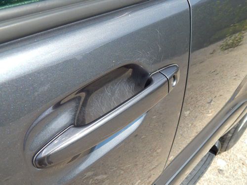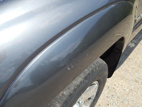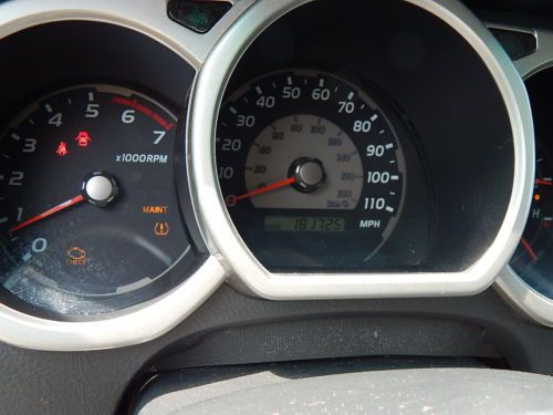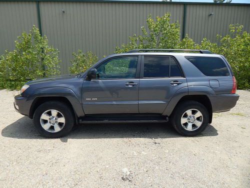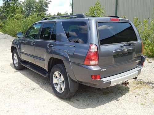 Up for sale is this 2004 Toyota 4Runner with a 4 liter V6 DOHC engine, an automatic transmission, and 4WD. The truck comes equipped with a gray exterior and a gray cloth interior. The SR5 package includes premium features such as a power sunroof and power sliding rear window. This vehicle has average wear and tear, like any used vehicle - the front bumper is scratched and chipped, paint chips on the hood have oxidized, scratches exist behind all the door handles, and there are a few deep scratches in areas like the left side front quarter panel. The wheels are scuffed and the finish is peeling on all of them. The interior is mostly clean but the seats and carpet are stained in places. Also, the rear liftgate doesn't completely latch when shut and the check engine light is on. This truck runs and drives well, the tires have good tread, and the A/C blows cold.
