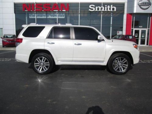 Convenience Package; Preferred Accessory Package; 4.0L V6 SMPI DOHC; 4WD; Black w/Leather Seat Trim; 4WD; Alloy wheels; Anti-Theft Alarm System; Leather; Limited Package; Navigation; Navigation System w/JBL Audio; Power Tilt & Slide Moonroof w/Sunshade; Right & Left Individual Air Conditioner; and Sunroof / Moonroof. If you`ve been yearning to get your hands on just the right 2010 Toyota 4Runner; well stop your search right here. This is the perfect; high reliability SUV that is guaranteed to keep on chugging along for years and years. You just simply can`t beat a Toyota product. Smith Nissan is Western Arkansas, Eastern Oklahoma and NW Arkansas' premier, family owned and operated dealership. Smith has Nissan certified preowned cars and trucks plus plenty of Fords, Chevrolets, Toyotas and Hondas in stock. Ask about our market based pricing at Smith which offers our customers their best value for their money.