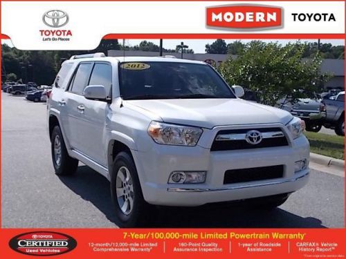-**Certified**- PRICED BELOW MARKET!! THIS 4Runner WILL SELL FAST! This 2012 Toyota 4Runner SR5 looks great with a clean Black/Graphite interior and Blizzard Pearl exterior! Oil Changed, New Engine Air Filter, New Cabin Air Filter, New Wiper Blades, Gold Star Complete Dealer Inspection, State Inspection Completed, and Emission Inspection! -CD Player- -Convenience Package- Our pricing is very competitive and our vehicles sell quickly. Please call us to confirm availability and to setup a time to drive this 4Runner! Please Contact us at 866-890-6581. WE ARE LOCATED AT 3178 Peters Creek Parkway, Winston Salem, NC 27127 This vehicle has been put through a complete 70 pt. mechanical and safety inspection and is CARFAX certified. Please call us today for more information @ 866-890-6581.