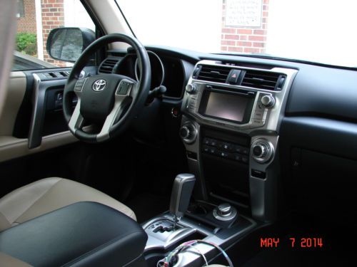 There are no defects on 4runner looks new with no dings, chips, scrapes or scratches. Wife's car and my kids are 21 and 23 so no car seats or eating in car. Tan/black leather interior with black carpet. has 3rd row seat that stows away flush with floor, automatic running boards that stows away when door is closed. Push button start with no key just key fob. Limited comes with full time all wheel drive and can switch to four wheel drive also has 4 wheel low. Full frame off road tough. Audio, phone and nav are all touch screen and voice commanded. All hands free. This has 9000 miles and comes with full factory bumper to bumper warranty and Toyota care maintenance. Car is mine and tag and titled in my name and parked at my house. BB and T bank holds lien release transaction goes thru them for security. Truck is like new never any paint or accidents. 20 INCH RIMS FACTORY. way cheaper then new and 9000 miles thats it. Full warranty. Call 410-274-7424 with any questions. Private party owns and never abused. New truck will be here in 2 weeks or less Wife needs to drive till it comes in.