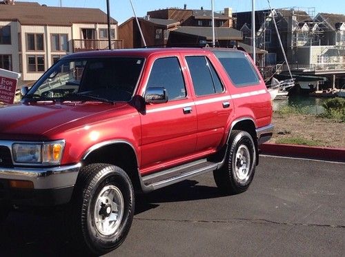 I appreciate any and all who take a moment to read what I have posted. This is a longer than average post. Hopefully the post illustrates how this 4runner has been meticulously cared for and details the well over $10,000 in service, parts, and care to keep it in the best possible driving condition. I feel that whoever purchases this truck will get new car amenities with the significantly lower cost of older car maintenance, registration and insurance (along with older Toyota durability and reliability) So here are the details: 1992 Toyota 4runner SR5 3.0L V6 SOHC 12v FI · 89,000 miles · Clean Title (pink slip in hand) · Recently smogged (with valid form in hand and already on file with DMV) · Power Windows (including rear cargo door window) /Mirrors/Locks/Moonroof · AC · Shift on the fly 4WD · Towing package · Cruise Control · Pushbutton overdrive and Electronically Controlled Transmission (ECT) · Bluetooth/CD/AM/FM/MP3/USB/AUX · Front and rear chrome bumpers · Complete fold down rear seats · Rear heater · Rear window/Wiper/ Defroster · Tilt Wheel · Power Steering · Alloy Wheels · Rear Wheel ABS · Off-road 265/75/15 tires For more details please continue to read. Every item or service described has been purchased and professionally installed either by Toyota/Scion of Sunnyvale and Auto Sound Specialists in Union City. Everything described is fully documented with receipts. All service records are verifiable. Whoever purchases this truck will get every receipt and manual (if applicable) to everything listed. All of the following parts were purchased new from, and professionally installed by Toyota/Scion of Sunnyvale. at 65,000 miles (all receipts and records are available) · Engine Block (short) · Water Pump · Timing Belt · Tensioner · Idler · Thermostat · Engine Oil Pan Gasket Plate · Knock Sensor Wire · PCV Hose · 265/75/15 tires mounted/balanced (with new valve stems and 8 ww wheel weights) · Front rotors machined and new brake pads. · New heavy crank Truestrart Battery · power steering pump and pulley · Full ignition system replacement (Distibutor,rotor, cap, ignition coil, air mass meter boot, ignition wire set, spark plugs) · Full Air Conditioning service · Cooling System Flush Total including parts, labor, and taxes $10,142.44 (all receipts come with vehicle) All of the following parts/services were purchased from, and professionally installed by Auto Sound Specialist Union City (all receipts and records are available) · Removed: factory alarm system (factory stock alarm will be included if next owner wants to return truck to original condition) · Replaced with New Keyless Entry/Alarm with shock sensor and engine kill/ two key fobs. · Installed: 5% Window Tint on rear cargo and passenger windows (due to this model year not having OEM cargo cover to keep rear cargo cool and out of sight) · Removed factory am/fm/cassette head unit. (factory stock head unit will be included if next owner wants to return truck to original condition) · Replaced with New Pioneer 6500 Bluetooth/CD/Radio/USB/Aux. Head Unit (fully compatible with all ipod/iphone/android products.) · Replaced blown factory speakers with new OEM specified speakers (both front/rear 4 speakers total) · Inoperable driver interior rear window switch relay replaced. (Now rear cargo door window fully operational from driver area switch and outside key switch.) · Total for parts, labor, taxes $1,238.97 (all receipts and warranties will be provided) Negotiating points. · Dash board pad has splits in vinyl, · Power antennae inoperable, · Ash tray loose, · Passenger map pocket (lower part of door) loose. · Rear head rest have been removed, · Various scratches in paint. Of course there are newer or similar suv’s like the Tahoe, pilot, sant'e fe. Mdx, Durango, suburban, pathfinder, sequoia, land rover, range rover, escalade, trooper, jeep, on CL at different price points with various pros and cons, newer body styles but I will humbly say that one would be hard pressed to find one in the condition of this one.