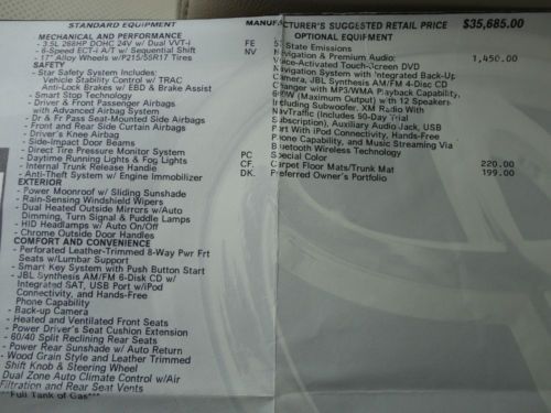 MECHANICAL AND PERFORMANCE 3.5L 268HP DOHC 24V w/ Dual VVT-i 6-Speed ECT-i A/T w/ Sequential Shift 17" Alloy Wheels w/P215/55R17 Tires SAFETY Star Safety System Includes: Vehicle Stability Control w/ TRAC Anti-Lock Brakes w/ EBD & Brake Assist Smart Stop Technology Driver & Front Passenger Airbags with Advanced Airbag System Dr & Fr Pass Seat-Mounted Side Airbags Front and Rear Side Curtain Airbags Driver''s Knee Airbag Side-Impact Door Beams Direct Tire Pressure Monitor System Daytime Running Lights & Fog Lights Internal Trunk Release Handle Anti-Theft System w/ Engine Immobilizer EXTERIOR Power Moonroof w/ Sliding Sunshade Rain-Sensing Windshield Wipers Dual Heated Outside Mirrors w/Auto Dimming, Turn Signal & Puddle Lamps HID Headlamps w/ Auto On/Off Chrome Outside Door Handles COMFORT AND CONVENIENCE Perforated Leather-Trimmed 8-Way Pwr Frt Seats w/Lumbar Support Smart Key System with Push Button Start JBL Synthesis AM/FM 6-Disk CD w/ Integrated SAT, USB Port w/iPod Connectivity, and Hands-Free Phone Capability Back-up Camera Heated and Ventilated Front Seats Power Driver''s Seat Cushion Extension 60/40 Split Reclining Rear Seats Power Rear Sunshade w/ Auto Return Wood Grain Style and Leather Trimmed Shift Knob & Steering Wheel Dual Zone Auto Climate Control w/Air Filtration and Rear Seat Vents