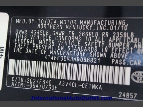 2010 TOYOTA CAMRY LE, IMMACULATE, AUTOMATIC, 4 CYLINDER, ALL POWER OPTIONS, A MUST SEE AND DRIVE, LIKE NEW IN/OUT, MOSTLY HIGHWAY MILES, AC, ABS, CRUISE CONTROL, FRONT AIRBAGS, SIDE AIRBAGS, CD PLAYER, STEERING CONTROLS, WILL NOT LAST -- MOST OF OUR VEHICLES ARE HIGH QUALITY, HAND PICKED, ONE OWNER IN A LIKE NEW CONDITION WITH A CLEAN CAR FAX. ALL ARE FULLY INSPECTED, SERVICED AND RECONDITIONED, THOSE THAT DO NOT MEET OUR MECHANICAL CRITERIA ARE NOT OFFERED FOR SALE. MOST OF OUR VEHICLES ARE COVERED WITH THE MANUFACTURER WARRANTY OR A 3 MONTHS/4500 MILE WARRANTY. FINANCING IS AVAILABLE AND TRADES ARE ALWAYS WELCOMED. FOR SIMILAR GREAT DEALS PLEASE VISIT OUR WEBSITE http://www.InternationalAutoOutlet.com At International Auto Outlet, we take pride in maintaining a large selection of fully reconditioned, inspected, certified vehicles. With over 200 quality certified cars, vans, and trucks from local dealer trades, overstocked inventory, off-lease manufacturer auctions, bank repossessions & open auctions, we have the perfect vehicle for you- and your budget. Call, email or visit our website today.