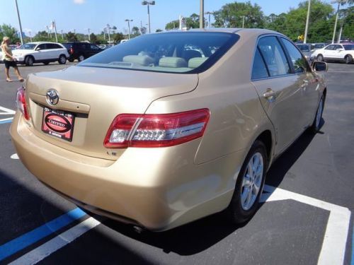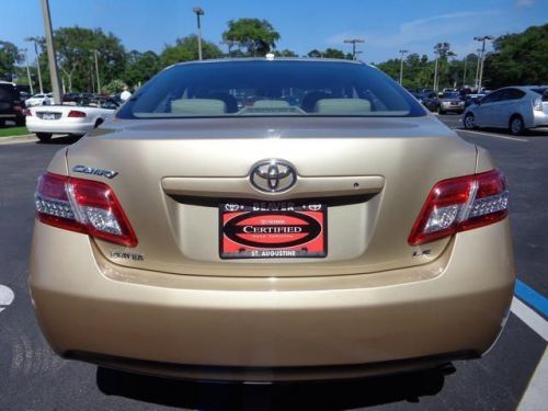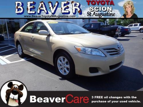 For an ultra comfortable long distance road tripper, you can't go wrong with the Camry. Toyota Certified Pre-Owned means you not only get the reassurance of a 12mo/12,000 mile Comprehensive warranty, but also up to a 7yr/100,000-Mile Powertrain Limited Warranty, a 160-point inspection/reconditioning, 1yr Roadside Assistance, trip-interruption services, rental car benefits, and a complete CARFAX vehicle history report. This car is nicely equipped with features such as Camry LE, 4D Sedan, 2.5L I4 SMPI DOHC, 6-Speed Automatic Electronic with Overdrive, FWD, Gold, LEATHER, MUST SEE!, NONSmoker, One Owner, PRISTINE, 4-Wheel Disc Brakes, 6 Speakers, ABS brakes, Air Conditioning, AM/FM radio, Brake assist, Bumpers: body-color, CD player, Delay-off headlights, Driver door bin, Driver vanity mirror, Dual front impact airbags, Dual front side impact airbags, Electronic Stability Control, Four wheel independent suspension, Front anti-roll bar, Front Bucket Seats, Front Center Armrest, Front reading lights, Fully automatic headlights, Illuminated entry, Knee airbag, Low tire pressure warning, Meteor Fabric Seat Trim, MP3 decoder, Occupant sensing airbag, Outside temperature display, Overhead airbag, Overhead console, Panic alarm, Passenger door bin, Passenger vanity mirror, Power door mirrors, Power driver seat, Power steering, Power windows, Radio: AM/FM CD Player w/MP3/WMA Playback Capable, Rear anti-roll bar, Rear seat center armrest, Rear window defroster, Remote keyless entry, Speed control, Speed-sensing steering, Split folding rear seat, Steering wheel mounted audio controls, Tachometer, Telescoping steering wheel, Tilt steering wheel, Traction control, and Variably intermittent wipers. Delivers fuel economy to an estimated 26 combined. Named a 2011 Consumer Guide Recommended Buy. Gold 2011 Beaver Toyota Camry LE i