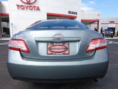 Camry LE, Toyota Certified, 4D Sedan, 2.5L I4 SMPI DOHC, 6-Speed Automatic Electronic with Overdrive, FWD, Green, Bisque w/Meteor Fabric Seat Trim, MUST SEE!, NONSmoker, One Owner, and PRISTINE. New Green 2011 Beaver Toyota Camry LE is a 4D Sedan FWD . This Florida Sedan has a 2.5L I4 SMPI DOHC engine.
