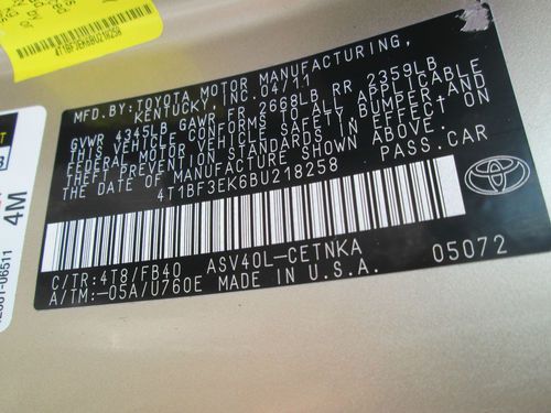 You are bidding on a 2011 Toyota Camry 4 door Sedan. Powered by a 4 cylinder engine with automatic transmission. Features power locks & windows, cold a/c, cruise, cd, keyless entry, with only 24K highway miles. This vehicle is sold as-is with no warranty implied or given. Test drives are encouraged and welcome before auction ends. More pictures available upon request. We reserve the right to end auction early due to local sale. If you have any questions call Kaleigh at 724-437-7601. This is a NO RESERVE AUCTION! Good Luck Bidding!!!