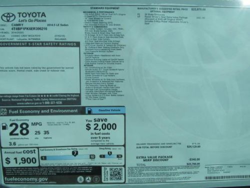Come to the experts! All the right ingredients! Here at Butler Toyota Scion, we try to make the purchase process as easy and hassle free as possible. We encourage you to experience this for yourself when you come to look at this fantastic-looking 2014 Toyota Camry. This great Toyota Camry is just waiting to bring the right owner lots of joy and happiness with years of trouble-free use. It is nicely equipped with features such as 4-Wheel Disc Brakes, 6 Speakers, ABS brakes, Air Conditioning, AM/FM radio, Brake assist, Bumpers: body-color, CD player, Delay-off headlights, Driver door bin, Driver vanity mirror, Dual front impact airbags, Dual front side impact airbags, Electronic Stability Control, Fabric Seat Trim, Four wheel independent suspension, Front anti-roll bar, Front Bucket Seats, Front Center Armrest, Front reading lights, Fully automatic headlights, Illuminated entry, Knee airbag, Low tire pressure warning, MP3 decoder, Occupant sensing airbag, Outside temperature display, Overhead airbag, Overhead console, Panic alarm, Passenger door bin, Passenger vanity mirror, Power door mirrors, Power steering, Power windows, Rear anti-roll bar, Rear seat center armrest, Rear side impact airbag, Rear window defroster, Remote keyless entry, Speed control, Speed-sensing steering, Split folding rear seat, Steering wheel mounted audio controls, Tachometer, Telescoping steering wheel, Tilt steering wheel, Traction control, Trip computer, and Variably intermittent wipers. Butler Toyota Scion is Indiana's largest Toyota Scion dealer. We have been doing business with integrity since 1966. Be sure to visit WWW.BUTLER-TOYOTA.COM for exclusive Butler website specials.