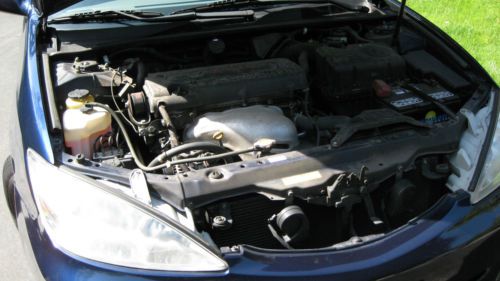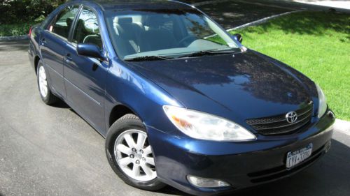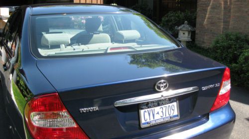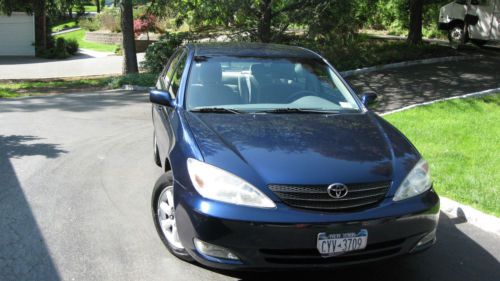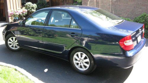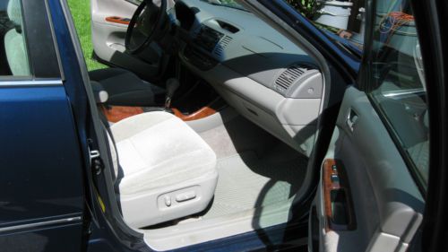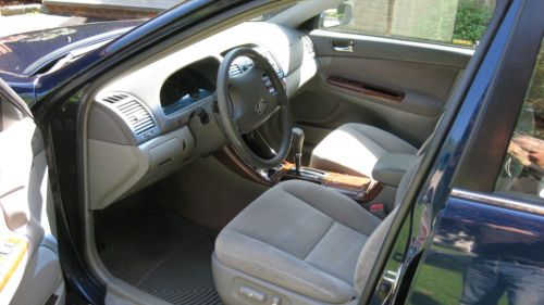 2004 TOYOTA CAMRY XLE SEDAN- 2.4 LITER 4 CYL DOHC 16 VALVE ENGINE. DARK BLUE WITH GRAY INTERIOR. CLEAN THROUGHOUT. EVERYTHING IN FINE WORKING CONDITION WITH 90,000 MILES. ORIGINAL OWNER IN A SMOKE-FREE ENVIRONMENT. 16 INCH ALUMINUM WHEELS, FULL SIZE SPARE TIRE- TOP QUALITY TIRES WITH 5000 MILES ON THEM. 4 WHEEL DISC BRAKES-ANTI-LOCK BRAKE SYSTEM. MULTI-REFLECTOR HALOGIN AUTO OFF HEADLAMPS-DAYTIME RUNNING LIGHTS W/AUTO ON/OFF-COLOR KEYED POWER, HEATED OUTSIDE MIRRORS-FOG LAMPS-AUTO CLIMATE CONTROL W/AIR FILTRATION-CRUISE CONTROL-JBL PREMIUM AM/FM/CASS/6DISC CD CHANGER W/8 SPEAKERS IN 6 LOCATIONS-POWER WINDOWS AND DOOR LOCKS-WOOD GRAIN STYLE INTERIOR TRIM-AUTODIMMING REAR VIEW MIRROR W/COMPASS HOMELINK-MULT-INFORMATION DISPLAY WITH STEERING WHEEL CONTROLS-REAR WINDOW DEFOGGER-THEFT DETERRENT SYS/ALARM/ENG IMMOBILIZER-CARPET CARGO MAT SET.