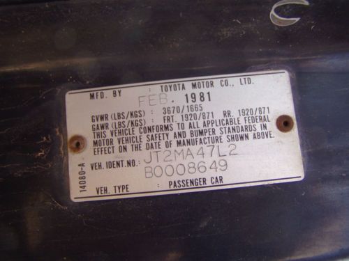 FOR SALE BY OWNER- FOR SALE IS MY 1981 TOYOTA CELICA SUPRA HATCHBACK, THIS IS A RESTORATION PROJECT OR PARTS CAR DEPENDING ON YOUR PERSONAL PLANS. THE WHOLE CAR IS HERE, PARTS REMOVED FOR RESTORATION WORK ARE INCLUDED IN THIS SALE. PLEASE CONTACT ME IF YOU HAVE DETAILED QUESTIONS OR ARE INTERESTED IN CERTAIN PARTS. THIS IS THE SECOND 6 CYLINDER OFFERED IN THE SUPRA LINE, A 2.8 LITER ELECTRICALLY FUEL INJECTED IN-LINE ENGINE FOR GREAT TORQUE. THE 5 SPEED IS ONE OF THE BEST EVER BY TOYOTA. PLEASE ASK ALL QUESTIONS BEFORE BIDDING, AND HAVE PERMISSION FROM WHOEVER YOU NEED IT FROM TO BID. THIS CAR IS FOR SALE LOCALLY AND THE AUCTION MIGHT END AT ANY TIME, OFFERS ARE ENCOURAGED AND APPRECIATED. THIS IS A SOLID CAR WITH HIGH QUALITY PARTS THROUGHOUT, THIS CAR WAS A CUSTOM UNIT IN IT'S DAY WITH STAINLESS SIDE TRIM, CUSTOM WHEELS AND PAINT, 4 WHEEL DISC BRAKES AND SPORT SUSPENSION. ALL THE LUXURY FEATURES REMAIN, A GOOD FOUNDATION TO START WITH. THANK YOU FOR LOOKING AND HAPPY BIDDING. THANK A SOLDIER AND THIER FAMILIES FOR ALL THE FREEDOM WE ENJOY DUE TO THIER HARD WORK BOTH HERE AND OVERSEAS. WE NEED THESE HARD WORKING PROFESSIONALS TO CONTINUE TO PROTECT OUR WAY OF LIFE. |