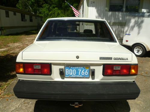 This auction is for a 1982 Toyota Corolla in excellent condition. Has A/C, cruise control, an MP3/CD stereo, is very clean and it runs good! My grandparents bought this car new in 1982 and I am the second, the current, and only other owner of this Corolla. It is virtually impossible to find another Corolla this old in this good of condition! Original paint, 3T-C engine, K&N air filter, original wheels, have the title in my name, it's a great car! Have had people drive up and want to but this car several times. Now, it's not perfect. Was in a minor fender bender recently, so it does need a little body work, mainly on the hood to bring it back to excellent shape. See the photos. Also the passenger door rubs ever so slightly when opening as does the hood when opening, both from the fender bender. There are only two or three pea sized rust spots, which can be easily fixed with a little time, bondo, primer, and an included can of Sherwin Williams automotive paint that was made to exactly match the current paint color on this car. Also the driver door had a couple of dents which have been fixed and the lower panel only has been repainted with the Sherwin Williams paint. It looks great but if you wanted to make it look perfect, which it can, you might need to spend some more time putting on more coats of paint and wet sanding with four thousand grit sandpaper or finer. But it is nice as it is. You will also need a new radiator, this one has a tiny leak, and if you need heat, will need a new heater core also. You can use the A/C to defrost in the winter if your winters are mild, but just keep that in mind for defrosting the windows during the winter time. Emergency break works good, brakes are in good shape, rear Michelin tires have about 75% life left and the front ones are still drivable but it is really time to replace the front tires. Does not leak oil. The stereo is new. Has a new drive train. Has tinted windows. The driver side window tint has a small tear as seen in the photo. The rest of the windows are fine. Window tint is less than a year old. Has a trailer hitch and a working flat four wiring harness. Spare tire is good. Low fuel light bulb on dash is out, but fuel gauge and all gauges work properly. Interior light works but the switch broke so you have to use the key or something to move between off, door, and on. Not a big deal. Am selling this great Corolla because I bought a Tacoma truck for work, do not need two vehicles, and do not want to spend the time and money to fix the radiator and the hood. Also there are a couple of pieces of plastic trim on the front by the headlights that are cracked as seen in the photos. All of the original trim is still on the vehicle and in good shape, except for those couple of pieces. It is a five speed manual transmission. The miles are the original miles. This car has spent most of it's nights in a garage or under a car cover so that is why it is in such good condition. One tiny crack on the dashboard but otherwise it is also in excellent shape, as seen in the photos. Seats are in excellent condition. Oh, the driver side seat belt is a little frayed but it is only an aesthetic concern, not a safety concern. And included is a matching seat belt webbing if you want to replace that. The ceiling material has been replaced, the original one was falling down, and the current one is in excellent shape and it is not falling down. Has an antique Florida license plate. No bumper stickers or stickers of any kind on the car. All the windows work properly. All the locks work properly. So in summary, it is basically impossible to find another Corolla this old, in this good of condition, that runs this good; except for this slight damage (which you may be able to fix yourself in a few days) resulting from the minor fender bender. That's it! Have enjoyed driving this great car for many years and once you fix the front end of the body, am sure that you will enjoy driving it for many more years!