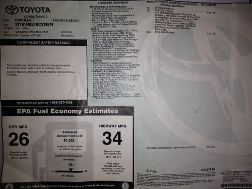 My next door neighbor is selling this fantastic 2011 TOYOTA COROLLA LE 4 door sedan in metallic gray color exterior, light gray cloth interior. This car only has 17,800 miles on it!!! Smells like new, drives great and IT IS A TOYOTA--will last forever!! Please check out the photos (more available on request) including the original sticker for more details. The only damage is where someone obviously scraped the back lower quarter panel (see photo) in a parking lot. Also, the car has had an inspection and complete oil change, etc. at the Toyota dealer here--within the past two weeks. I will pass along information to them (they do not "get" computers much!) so you can set up a time to see it. There will be a deposit to hold the car if you want it, unless you come prepared with a cashiers check. THANKS for looking--don't pass this up!!