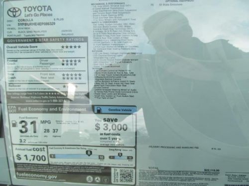 6spd! Come to the experts! Confused about which vehicle to buy? Well look no further than this wonderful 2014 Toyota Corolla. This car is nicely equipped with features such as 4-Wheel Disc Brakes, 6 Speakers, ABS brakes, Air Conditioning, AM/FM radio, Anti-whiplash front head restraints, Automatic temperature control, Brake assist, Bumpers: body-color, CD player, Delay-off headlights, Driver door bin, Driver vanity mirror, Dual front impact airbags, Dual front side impact airbags, Electronic Stability Control, Front anti-roll bar, Front Bucket Seats, Front Center Armrest, Front fog lights, Front reading lights, Front Sport Bucket Seats, Front wheel independent suspension, Heated door mirrors, Illuminated entry, Knee airbag, Leather steering wheel, Low tire pressure warning, MP3 decoder, Navigation System, Occupant sensing airbag, Outside temperature display, Overhead airbag, Panic alarm, Passenger door bin, Passenger vanity mirror, Power door mirrors, Power moonroof, Power steering, Power windows, Radio data system, Rear anti-roll bar, Rear window defroster, Remote keyless entry, Speed control, Speed-sensing steering, Split folding rear seat, Spoiler, Sport Fabric Seat Trim, Steering wheel mounted audio controls, Tachometer, Telescoping steering wheel, Tilt steering wheel, Traction control, Trip computer, and Turn signal indicator mirrors. Life is full of disappointments, but at least this fantastic Toyota Corolla will always be there for you and never let you down. Butler Toyota Scion is Indiana's largest Toyota Scion dealer. We have been doing business with integrity since 1966. Be sure to visit WWW.BUTLER-TOYOTA.COM for exclusive Butler website specials.