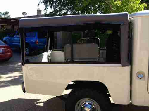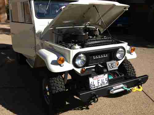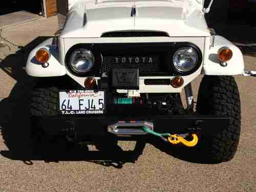 1964 FJ 45 shortbed pick-up: Extremely rare model and year. 1964 was the last year of non-removable tops. Solid cab and quieter. This 45 was frame-off restored in 2001 and has had updates since then to make it safe and comfortable. All rubber, seals and weather stripping replaced. New lines throughout. Re-built Chevy 305 that is solid without leaks. Custom dual exhaust. Advanced Adapters engine conversion. Power steering with tilt steering wheel and Saginaw box. Original "bottle" jack and accessories. Original Warn Winch with synthetic rope. OEM wheels and hub caps w/ BFG Mud Terrains.