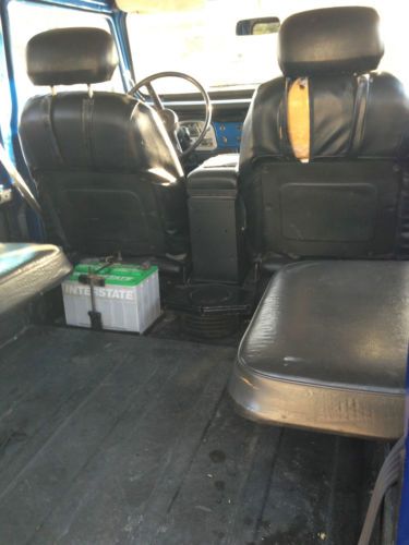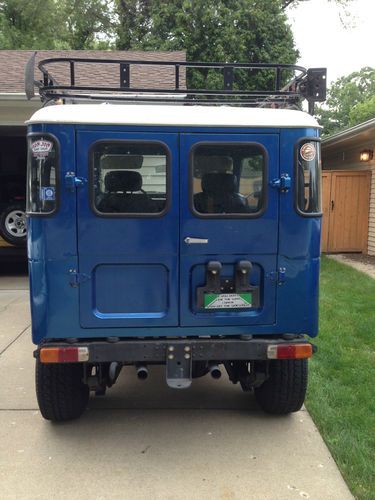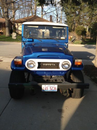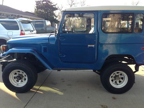 For sale is my 1974 Toyota Landcruiser fj40. It is electric blue with black interior. The body has 89,000 miles and has had frame-off restoration. It has a rebuilt chevy 350 small block v8 engine with a Hurst automatic shifter. It has 4 wheel drive with manually locking front hubs. The engine has approximately 20,000 miles on it. The engine runs great! It comes with the white hard top with an iron roof rack with a jack, shovel and unique toyota oversized fog lights. I also have diamond plate half doors and a diamond plate tailgate when the top is off. It is missing the headliner on the inside which can easel be replaced. This fj40 is not showroom quality, but is in very good shape! I hate to get rid of it but I recently moved and I do not have room for it in my new garage.