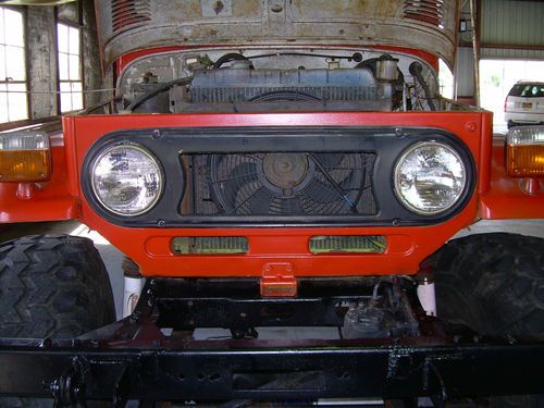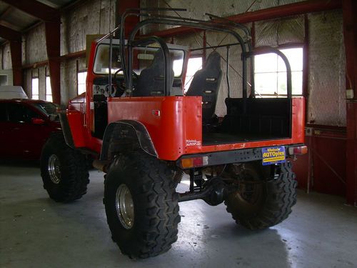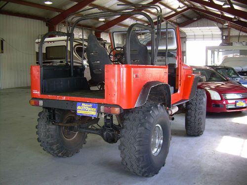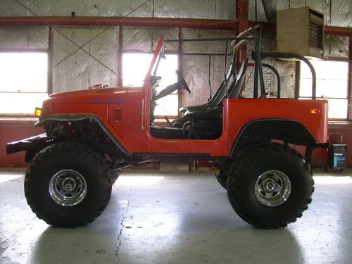 This is a completely custom built Mud-toy style vehicle. The chassis is a 1975 Toyota Land Cruiser. The original mileage is unknown on the vehicle and the odometer has been reset. The vehicle has been painted bright orange, while the inside and interior of the vehicle has been coated black. The seats are after-market bucket seats.