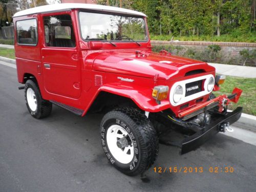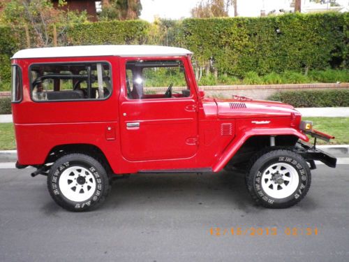 Up for sale is an absolutely stunning 1976 Toyota FJ40 Land Cruiser. (Not A Off Frame Restoration) California Solid Truck! You will not find another one like this! These are very rare to find, especially in this shape. This Truck is gorgeous all the way around! Beautiful exterior and Interior . Truck is pristine inside and out. The pictures don't do it's justice. Original Front Seats and Jump Seats,!!!!! Beautiful dash with no cracks or fades. 4WD Works perfectly. New Headliner. All done inside and out. Rear fold down jump seats. Ambulance Doors, Engine is very tight and strong. Comes with a Floor Jack , and a Winch . Tires are all Good, They are "Runway Enduro A/T Tires". A dream to drive this Truck! Very clean engine . You will not find another one like this. This truck is very rare and desirable. Please if you have any questions at all, feel free to email me or give me a call at anytime. Important : If you have a Score of less then 3 rating , and you are a Bidder please, Call me 661 209-6054 or Email me before Placing a Bid!!!!! Your Bid will be removed If , I am not notified. http://youtu.be/pnWwnuC0TNw Please look at Viedo, the contrast of viedo was not the best. If you have any question or want additionel Pictures, please call us. |