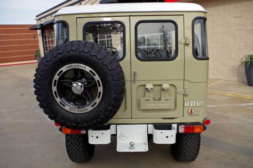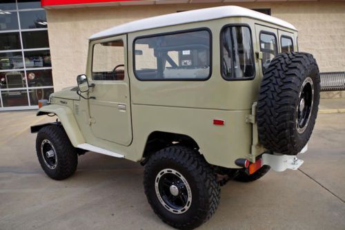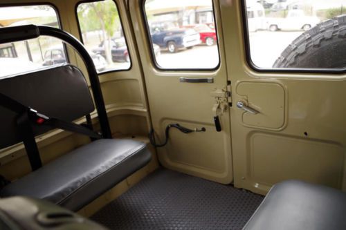 1976 Toyota FJ40 Land Cruiser 4x4. This FJ is in fantastic condition inside and out. In addition, this vehicle has been recently restored. This Land Cruiser features new Beige exterior paint with white top. A rebuilt 350 Chevy V8 resides under the hood with a new Edelbrock carburetor, alternator, and electric fuel pump. The original 4-speed manual transmission is mated to the four wheel drive system with front locking hubs. The rear differential is rebuilt with new seals, gears, and gaskets. It has new double custom exhausts and headers. The refreshed undercarriage includes a new 4? Rough Country lift with brand new 18? Incubus off-road wheels and new aggressive Toyo open-country tires. The interior has the original Toyota seats, dash, and door panels including jump seats with seat belts, new upgraded carpet, heavy-duty mats, new headliner, fresh black roll bar, and an optional rear heater. |
