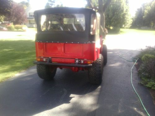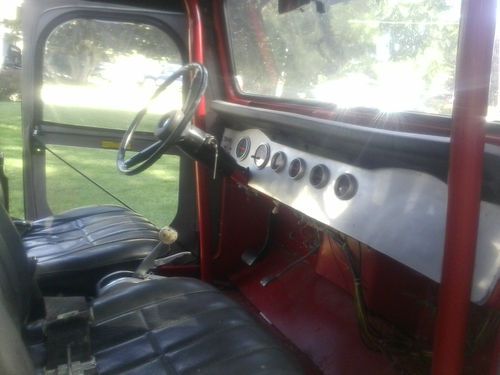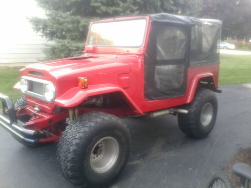 THIS IS A ONE OF KIND BUILT CUSTOM BUILT TOYOTA FJ 40,STARTED OUT AS A STANDARD 78 FJ 40,WAS STRIPPED DOWN ,EVRYTHING WAS REDONE,FRAME CLEANED AND PAINTED,IN VERY NICE SHAPE,NEW FIBERGLASS BODY WAS INSTALLED,HOOD WAS CUT OUT FOR TUNNEL RAM AT ONE TIME,NEW SOFT TOP,BUILT BIG BLOCK CHEVY MOTOR, COMP ROLLER ROCKERS,HEALTHY CAM,EDLEBROCK INTAKE AND CARB,CHROME ALT,ALUM. PULLEYS,.MOTOR CAME OUT OF A STREET ROD,GUY TOLD ME IT WAS FRESH,I TOOK VALVE COVER OFF,EVRYTHING LOOKS FRESH,I DONT KNOW WHAT IS DONE TO IT,BUT SOUNDS REALLY GOOD.BUILT 400 TRANS WITH CONVERTER,LADDER BARS,POSI REAR,FLOW MASTER DUAL EXHAUST,DUAL SHOCKS,CUSTOM STEERING LINKAGE,POWER DISC BRAKES,36 IN DICK CEPEK TIRES ON ALUM WHEELS,ONE TIRE HAS BROKEN BELT,ALUM RADAITOR,ELECTRIC FAN,NEWER CUSTOM FUEL TANK,HIGH VOLUME ELECTRIC FUEL PUMP.NEW FUEL PRESSURE REGULATOR,AUTO METER GAUGES,AFTER MARKET WIRE HARNESS,HURST LOCK OUT SHIFTER,NICE SEATS,CUSTOM RACING HARNESS SEAT BELTS,REAR SEAT IS SITTING IN IT,JUST NEEDS BOLTED DOWN. THIS FJ IS SOMETHING TO SEE,MOTOR IS VERY HEALTHY. SOUNDS AWESOME,LOTS OF POWER,JUST NEEDS MINOR FINISHING,NEEDS LOWER ALT BRAKET AND BELT INSTEAD OF THE HIGH ONE,THERES NOT ENOUGH ROOM FOR BELT ADJUSTMENT.NEEDS ADAPTER FOR AUTOMETER GAUGES,TURN SIGNALS NEED WIRED IN. ,ETC. JUST NEEDS A FEW MISC. THINGS TO FINISH IT UP RIGHT. I JUST INSTALLED A NEW BLUE OPTIMA BATTERY. THIS IS A AWESOME ,ONE OF A KIND LAND CRUISER,JUST NEEDS SOME MINOR FINISHING. RUNS AND DRIVES BUT NEEDS TRAILERED HOME. DONT MISS OUT ON THIS ONE OF A KIND FJ 40,YOU DONT SEE TO MANY THIS CLEAN !! YOU WONT SEE ANOTHER LIKE IT!!!! COME TAKE A LOOK IN PERSON!!