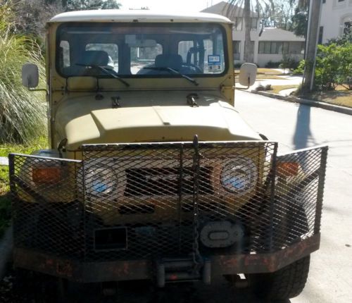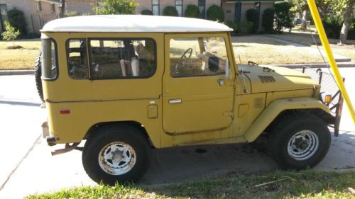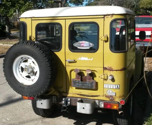 Here we have a really nice 1978 Toyota Land Cruiser FJ40 4.2L 4WD mustard yellow, all original!!! Only 121420 miles. Both master and slave cylinders for the clutch have been replaced. 4x4 works well. Took it down to the beach and gave the 4wd a test, and worked like a champ!! Winch may work, have not used it yet. This FJ40 runs great!!!!! Has a few leaks in the rear main and oil pan seal...added some lucas treament on last oil change....sealed up the leaks substantially. Transfer case also has small leak. Rust spots underneath seats in floor board, in rear corners, and floor at the rear door., but not too major. Nothing a little refurbishing will fix up. Fun car to have!!! RARE!!! I have more pics for serious bidders upon request...thanks! |
