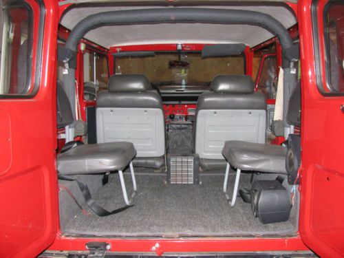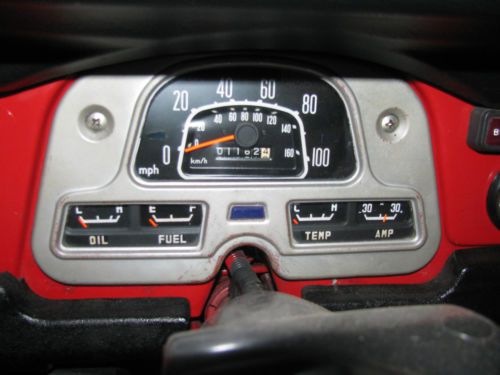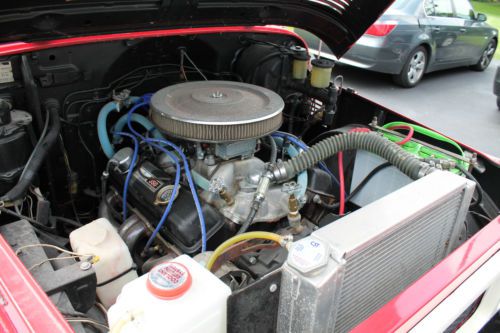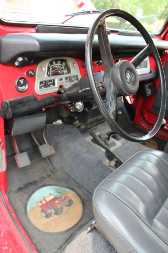 Red with original body in very good condition Chevy 350 crate motor, 4 speed transmission 33" Kelly Safari Tires, mild lift, padded roll bar, full carpet, heavy duty bumpers front and back Winch Soft top Low mileage on body since rebuild Most all receipts available from rebuild This is an excellent driver, gorgeous condition and a rate opportunity to own an iconic world class 4x4. |