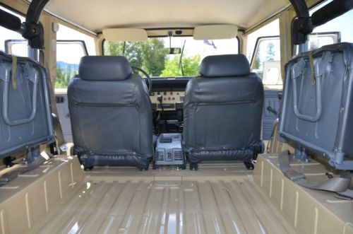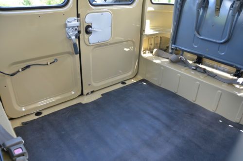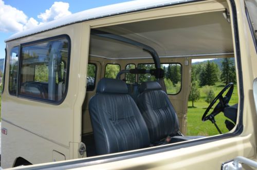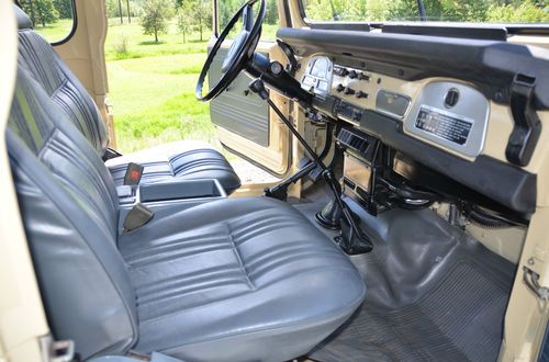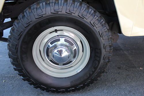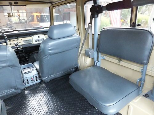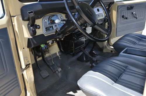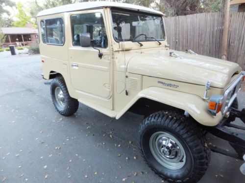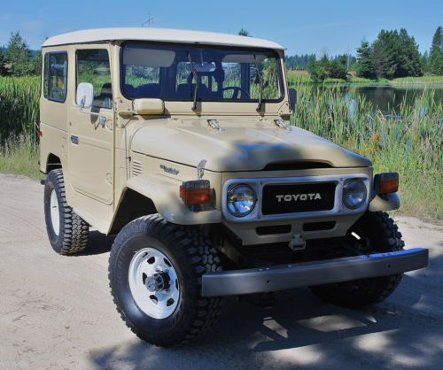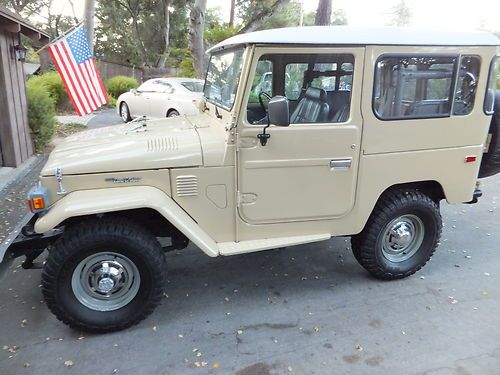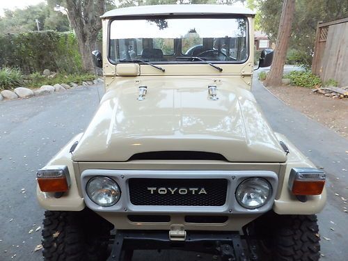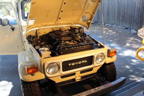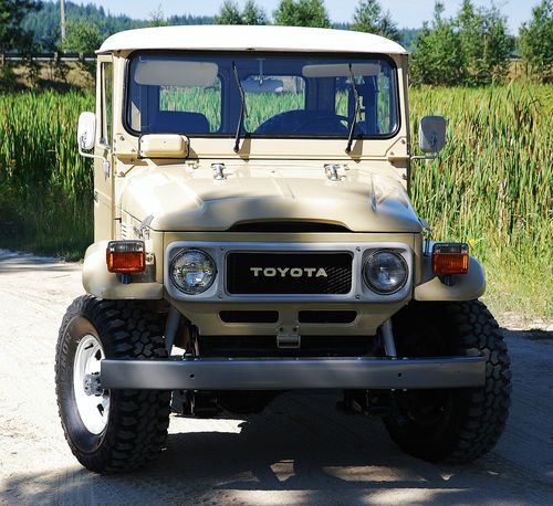 FJ40 comes with 2 sets of rims. The stock white, and the powder gray steel rims shown on the first few photos. The color is closest to the first photos, the shots with the white rims were taken with a filter and at sun set. True color is the first set of photos (lighter color) which is the stock, original Toyota Beige. Hard to find, rust free, original, fully restored. Power - Factory power steering on a stock 2F inline 4.2 motor. Good compression all around. Starts and runs great, holds the road straight and true. Has 3:70 road gears, shifts tight and smooth. Passes California emissions handily. Interior -- dash, door panels, mats, seat covers all like new. Original front mat, with added insulation and carpet underneath. Dash uncut, all gauges work. 108,000 original miles. Exterior -- brand new stock beige paint code throughout, lights all work, tow hitch, new steel powder coated wheels and caps. Comes with original off white slotted rims as well. New- Maxxis Mud TA's, door weather seals, shocks, bumper, radiator, battery, windshield, front seat covers, headliner, battery tray, blinkers and tail lights, Toyota badges, cap cover, front and rear carpet and insulation. I am selling this for a client who has clear California title. He purchased the FJ40 from me in August of 2012 after we did a full restoration on the vehicle. It is and always has been a west coast FJ. Since purchase it has a few hundred more miles and sits covered in his garage. I reserve the right to end the auction early. Here is a list of what I had done last year prior to selling to my client. The list of new parts is extensive and includes 5 new Maxxis Mud TAs, 31X10.50X15s on stock powder coated rims New door weather seals all around for a very tight cab New shocks New bumper New radiator New battery New seat covers (SOR) New windshield (OEM) New Headliner New battery tray New blinkers and tail lights New OEM Toyota badge and emblems New Stainless Screws throughout New Bumperettes New OEM license plate bracket, rear. New visor covers New door seals all around. New cap seal, no air flow, nice and tight. This is a very nice example of an original 1982 FJ40 that runs like new and is in excellent condition, inside and out. Last few photos are my 1983 FJ40 (BJ42) 3B Diesel. Full Frame off restoration that is very close to finished. 28 mpg, 72,000 original miles. MINT. Coming to eBay soon. Bid with confidence. Great 1982 FJ40 with CA smog certificate. |