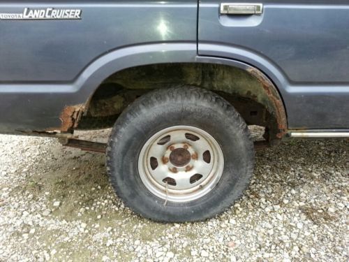 Up for auction is my 1985 Toyota FJ60 Land Cruiser. Chances are if your looking at this you already know what awesome vehicles these can be. I purchased this mid summer wanting to restore it but I have since changed my mind to wanting a 80 Series Cruiser instead. This LC has had 2 previous owners and has been in Ohio its whole life. Fortunately when it was new the owner took it to Tuff-Kote Dinol and had the entire truck undercoated. This has kept the frame and undercarriage in good shape over the years. Dont get me wrong it does have rust but no bad scaling or broken frame pieces like you might expect for a Cruiser in Ohio. As you can see from pics the body has some rust and holes but nothing that couldn't be fixed. I lifted carpet and looked at usual trouble spots around wheel wells and this area is in very good shape. Inside back sill by tailgate is rust free as well.