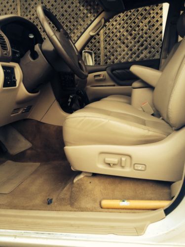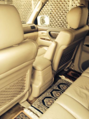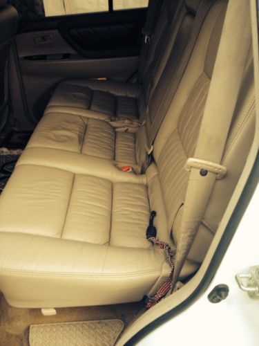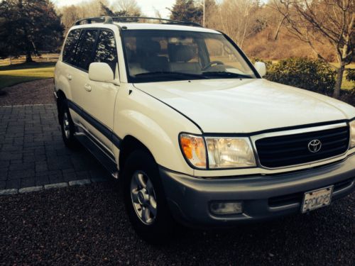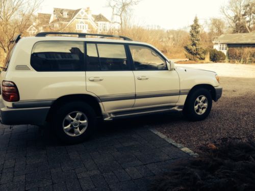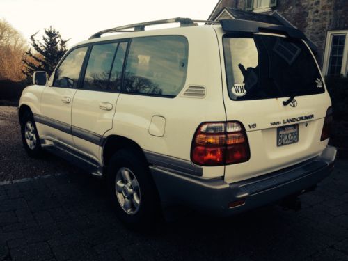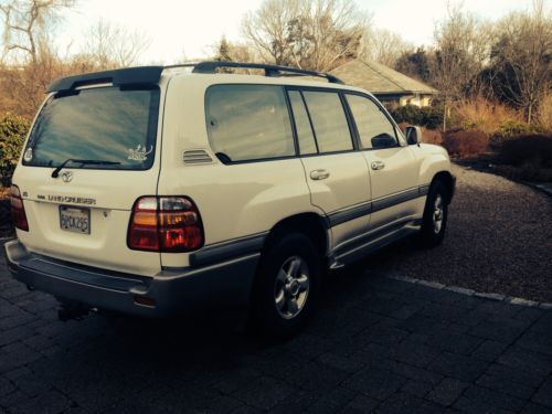1999 Toyota Land Cruiser , white with tan interior it has all of the standard LC toys, Everything is in working condition, ice cold air, heated seats, elect windows cruise control everything works. The car is tight, no rattles, front end tight , brakes, timing belt and tires recently done tires are 95%. Tow package , 3rd seat. The rear seat and 3rd seat never used. The carpet and leather is in great shape. Non smoker and garaged. The vehicles is a California car and still registered in Ca. Came east 8 months ago. It's the right color combination and drives great.