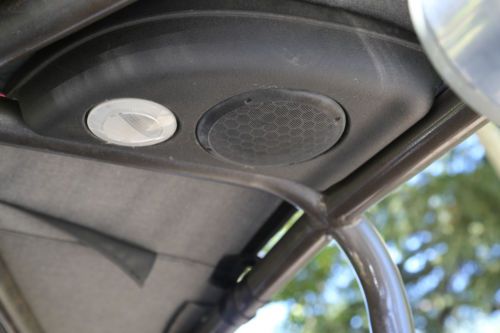 with speakers mounted on the cage. It also has a Kenwood 300 amp. Amplifier. The cage is a custom family cage with 3