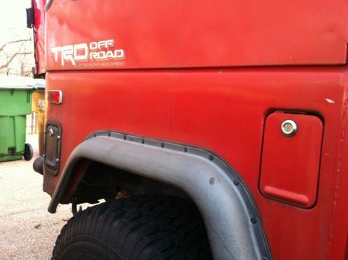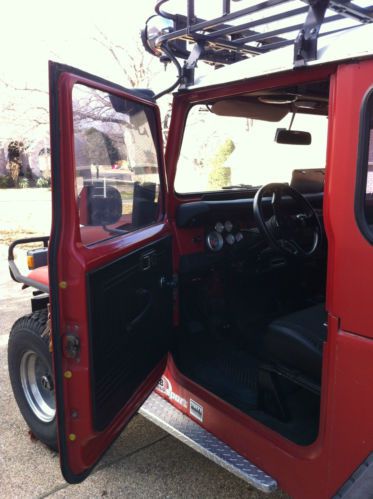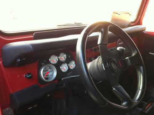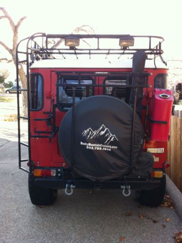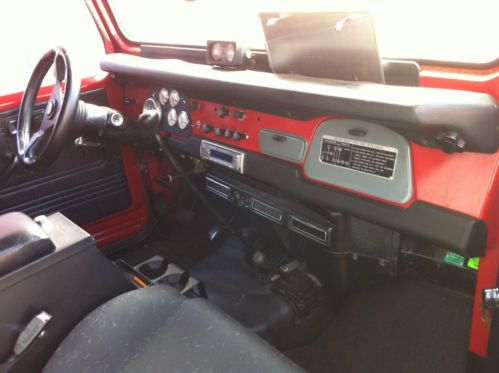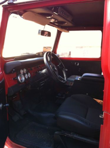 I originally bought this truck when the odometer read 9400 miles, since then I had installed a secondary tank in the main cabin under the passenger seat, last november i took it to get a complete revamp of the engine and drivelines all receipts can be included and made available. The below description is what was done back in 2006. I have had the truck since 2010 and have only put 10,626 miles on the engine, and it runs like a champ. A very reliable truck always cranks up even with the recent ice storms, never ceases to amaze me. I hate to get rid of her, but we are expanding the family and will need to start down sizing some of my toys. Please see the details from the original restoration by Rocky Mountain Cruisers. RMC Outback Roof Rack RMC Outback Bush Guard 6 KC Daylighter Lights with stone guards Rear Pro Comp Work Lights RMC Outback Swing Away Rack System Safari Snorkel 9500 lb Warn Winch Steel Horse Super Seats Bushwacker Fender Flares Rock Crawler Steel Wheels Tuffy Security Console RMC Overhead Console were added to this FJ40. This vehicle is equipped with a new Chevy Small Block Engine and GM Serpentine Belt Drive System, and a 5 speed Toyota Transmission with front disc brakes. Cruiser comes complete with Vintage Air Conditioning, AGR Power steering System, factory roll bar, front Steel Horse Super seats, rear jump seats, rear heater, Tuffy Security Console, and AM/FM/CD. During the restoration the rear quarter panels, and front fenders were replaced. The cruiser was then primed with 4 coats of high build primer and painted outside with 5 coats of Martin Senour Acrylic Enamel Freeborn Red paint. The interior was painted to match and then 4 coats of bedliner were applied to the floors. The dash was recovered and a clinometer was installed. New quarters and inner fender wells were installed and finished. Rear channel was completely rebuilt. Body tub was cleaned, primed and undercoated. Interior of tub was cleaned, primed, painted, and then 4 coats of liner were installed. The engine was topped off with Edelbrock Multi Port fuel injection. A custom exhaust was built. Suspension work was completed with a Skyjacker 4" lift and Rancho RS5000 shocks. Greasable shackles, pins, and ubolt skid plates were all installed. The following is a list of parts that were replaced and services that were performed during the restoration process. Parts Replaced High quality front turn signals and tail lights Front bumper Front door window channels Weather stripping all doors Front, side and rear emblems Rear reflectors Shifter knobs New poly tank Dash cover Recovered jump seats New headliner New Aussie vinyl mat kit (front and rear) Fan belts Heater hoses Oil and oil filter Spark plugs Cap Rotor Wires Air and fuel filters Shocks Skyjacker 4" lift kit Front axle seals (inner and outer) New rotors Front calipers Pads Shoes New brake hoses and brake lines All new wheel bearings front and rear Tie rod ends Wheel cylinders Heavy duty clutch kit Knuckle seals Transmission and transfer case were rebuilt and reinstalled Complete cooling system was replaced and new fluids added Charging system tested New battery and battery tray installed |