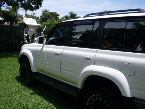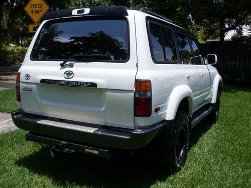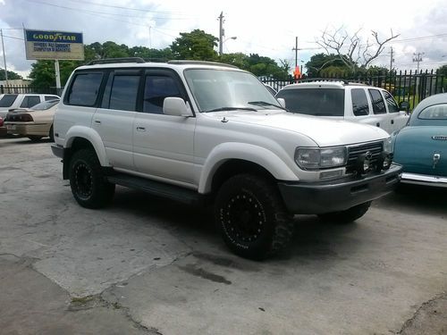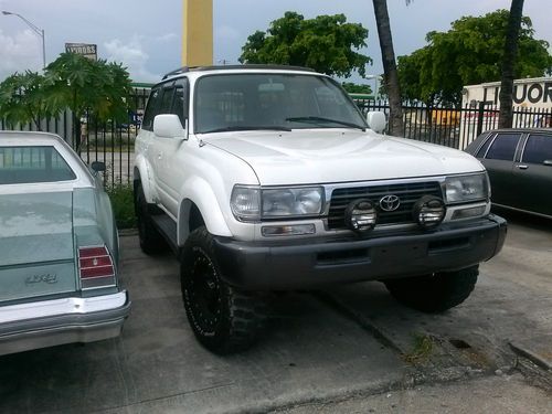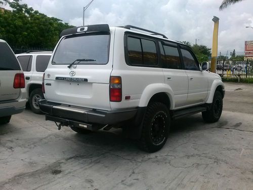 OFFERED TODAY AY A NO RESERVE AUCTION IS A 1996 TOYOTA LAND CRUISER . TRUCK IS IN AN EXCELLENT SHAPE BOTH INSIDE AND OUT.INTERRIOR IS CLEAN, NON-SMOKER NOR ABUSED, LEATHER SEATING , SUN ROOF , CD PLAYER , SEVEN PASSENGER SEATING AND MORE UPHOLSTRY IS IN ABOVE AVERAGE CONDITION WITH MINIMAL SIGNS OF WEAR. OUTSIDE FINISH IS NICE AND GLOSSY AND DOES NOT NEED ANY REPAIRS OR RE-CONDITIONING. ENGINE AND TRANSMISSION ARE IN GOOD WORKING ORDER , ALL REPAIRS AND MAINTANANCE WERE DONE USING OE OR UPGREADED PARTS, ODOMETER SHOWS AROND 130K MILES BUT IS NOT BELIEVED TO BE CORRECT , ALSO AIRBAG AND ABS LIGHT ARE ON CONSTANTLY , NEW BATTERY, ALTERNATOR AS WELL AS DRIVE BELTS, SYNTHETIC OIL IS BEING USED REGULARLY. STARTS AND GO THEY WAY IN SHOULD AND RUNS AND LOOKS GREAT. TIRES ARE IN GOOD SHAPE, MATCHING SET , HAVE LOTS OF TREAD TO GO. PROFFESSIONAL BODY LIFT MAKES IT EASY TO DRIVE IN ALMOST ANY ROAD CONDITION. CLEAR TITLE IN HAND FOR IMMIDIATE TRANSFER. TRUCK IS LOCATED IN MIAMI FL ZIP CODE IS 33150, I WILL BE GLAD TO HELP WITH SHIPPING ARRANGMENTS OR WITH PICK UP FROM AIRPORT ETC. ALSO I CAN HELP DELIVER VEHICLE TO SHIPPER FOR 20 MILES OR SO IF NEEDED .
