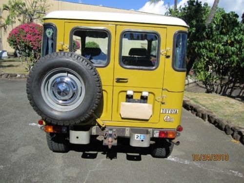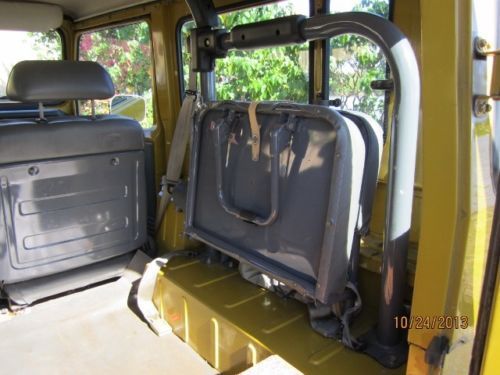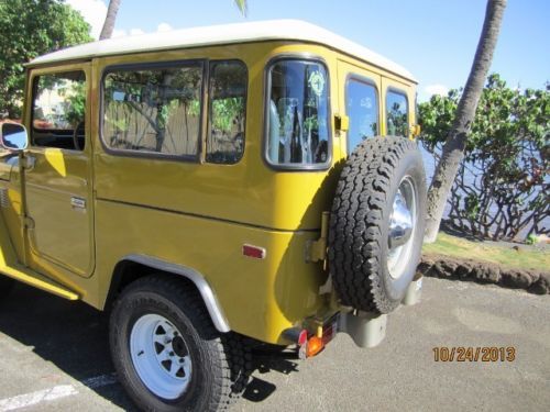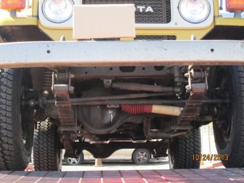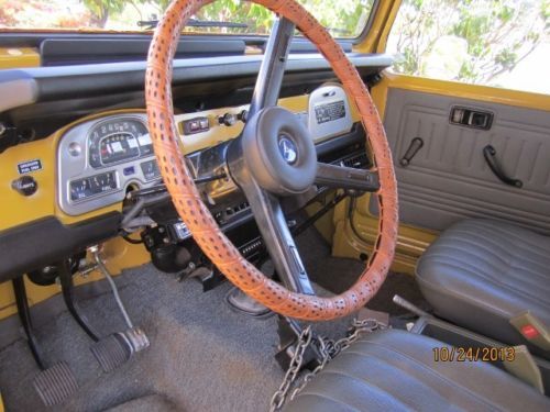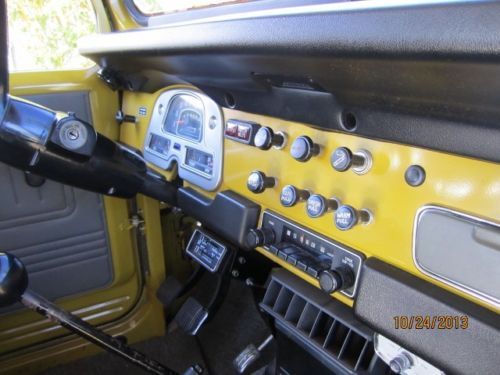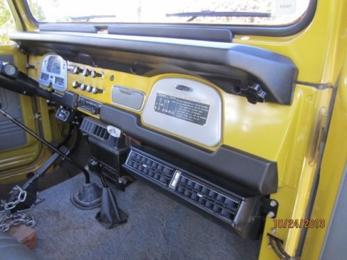 Summary Inside this iconic Land Cruiser you'll find a spacious and comfortable driving environment that has enough room to be your vehicle of choice for weekend adventures. The firm front, and folding opposing rear seat are wrapped in high quality OEM vinyl covers. Heavy duty OEM rubber floor mats in front and back. In front of the driver, a perfect dash pad, clear gauges and controls for the truck's accessories. Between the front passengers, two simple black shifters, one for the 4-speed transmission and one for the four-wheel drive system. The space between the front seats you will find the OEM center console. Connecting the driver to the road is a factory issue steering wheel which spins around the vintage "Toyota" emblem. The sale of this FJ40 includes the factory tool kit, jack, jack rods, touch up paint cans and owners manual. There are no dents, dings or damage to the body and no rust. The interior is flawless as well. The color is the original Toyota Mustard Yellow (paint code 532).