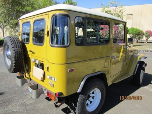 Original paint, frame, body 2F Motor, 4-Speed Transmission, factory-original AM radio, interior, gauges, seats, doors, door panels, glass, fenders, floors, tub, hood, top, bumpers, etc. This rust-free FJ40, looks, runs and drives excellent, never repainted, never restored, always cared for, garaged and maintained. EVERYTHING is in good working order. The original wheels were swapped for white spokes but we have the original wheels and two of the original tires.