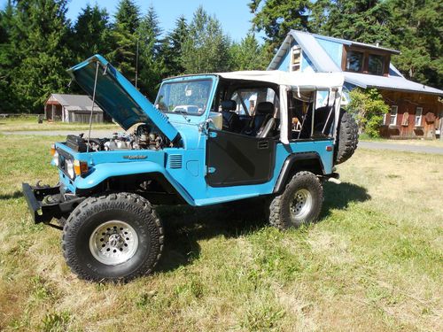 This is an adult owned cruiser that has had many significant upgrades, including: full roll cage, four point belt harness's, 4" skyjacker lift, 456 rear end, and the desirable ARB's front and back. The steering has been upgraded to Saginaw power steering, and this enhanced both highway and off road driving. The cracked windshield was replaced with new Toyota glass. The six cyl. 2F engine is legally desmogged, and pulls strong. The carburetor was upgraded to a Webor. 38/38 syncro, K&N Filter, headers, and Flow Master exhaust. The tires have just a few mile on them, and are 35x12.5x15SSR's and are mounted on alloy rims. All gauges work. And a tach. was installed. It has a CD player/stereo. Also sold with the cruiser are several tops, including a 1976 FJ40 hard top, side and rear doors (ambulance doors). the hard top is white and yellow. There is also the bimini top, rear dust panel and soft side doors. The blue paint still shines up nice (as shown in photos). There are no major rust issues, but it does have some small areas of rust in the usual places-back of the bed where the tailgate closes. There have been over 12K worth of improvements to the cruiser. It is perfect for your country property, hunting, exploring or whatever. And.. it has not been trashed by any off road fanatics. Please call 360 460 0630 for more information. Thanks for looking, and good luck bidding!
